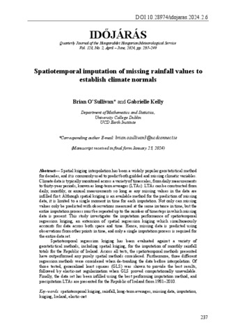 O’Sullivan, Brian and Kelly, Gabrielle (2024) Spatiotemporal imputation of missing rainfall values to establish climate normals. IDŐJÁRÁS = QUARTERLY JOURNAL OF THE HUNGARIAN METEOROLOGICAL SERVICE, 128 (2). pp. 237-249. ISSN 0324-6329 (print); 2677-187X (online)