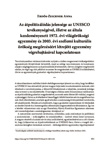 Erdős-Zeichner, Anna (2025) Az átpolitizálódás jelensége az UNESCO tevékenységével, illetve az általa kezdeményezett 1972. évi világörökségi egyezmény és 2003. évi szellemi kulturális örökség megőrzéséért létrejött egyezmény végrehajtásával kapcsolatosan. In: Doktorandusz hallgatók XII. konferenciájának tanulmányai. Eszterházy Károly Katolikus Egyetem Líceum Kiadó, pp. 101-111.