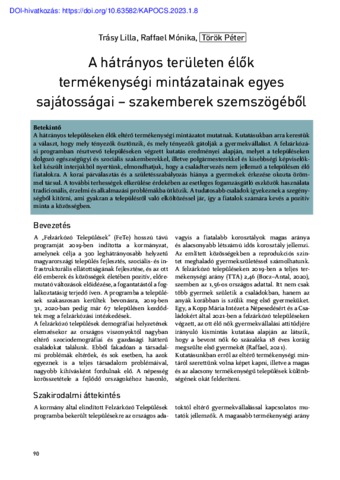 Trásy, Lilla and Raffael, Mónika and Török, Péter (2023) A hátrányos területen élők termékenységi mintázatainak egyes sajátosságai szakemberek szemszögéből. KAPOCS, 6 (1). pp. 90-102. ISSN 1588-7227