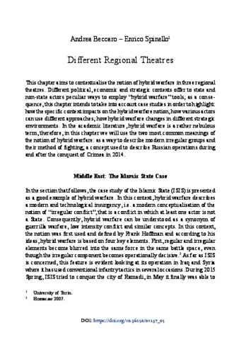 This chapter aims to contextualise the notion of hybrid warfare in three regional theatres. Different political, economic and strategic contexts offer to state and non-state actors peculiar ways to employ “hybrid warfare” tools; as a consequence, this chapter intends to take into account case studies in order to highlight: how the specific context impacts on the hybrid warfare notion; how various actors can use different approaches; how hybrid warfare changes in different strategic environments. In the academic literature, hybrid warfare is a rather nebulous term, therefore, in this chapter we will use the two most common meanings of the notion of hybrid warfare: as a way to describe modern irregular groups and their method of fighting; a concept used to describe Russian operations during and after the conquest of Crimea in 2014.