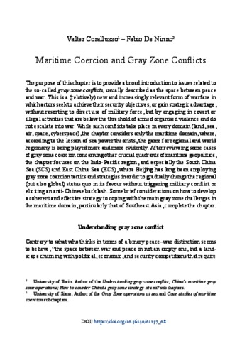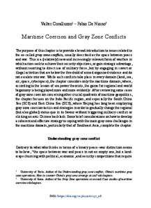 The purpose of this chapter is to provide a broad introduction to issues related to the so-called gray zone conflicts, usually described as the space between peace and war. This is a (relatively) new and increasingly relevant form of warfare in which actors seek to achieve their security objectives, or gain strategic advantage, without resorting to direct use of military force, but by engaging in covert or illegal activities that are below the threshold of armed organised violence and do not escalate into war. While such conflicts take place in every domain (land, sea, air, space, cyberspace), the chapter considers only the maritime domain, where, according to the lesson of sea power theorists, the game for regional and world hegemony is being played more and more evidently. After reviewing some cases of gray zone coercion concerning other crucial quadrants of maritime geopolitics, the chapter focuses on the Indo-Pacific region, and especially the South China Sea (SCS) and East China Sea (ECS), where Beijing has long been employing gray zone coercion tactics and strategies in order to gradually change the regional (but also global) status quo in its favour without triggering military conflict or eliciting an anti-Chinese backlash. Some brief considerations on how to develop a coherent and effective strategy to coping with the main gray zone challenges in the maritime domain, particularly that of Southeast Asia, complete the chapter.