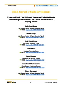 Akongo, Stella Rose and Ariapa, Martin and Otieno, David Alelah and Babu, Michael and Marandu, Daniel and Matimbwa, Ramadhani Ally and Giacomazzi, Mauro (2025) Extent to Which Life Skills and Values are Embedded in the Education Systems of Four East African Jurisdictions : A Scoping Review. GILE JOURNAL OF SKILLS DEVELOPMENT, 5 (3). pp. 2-24. ISSN 2732-3781