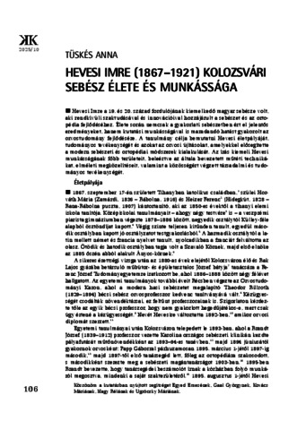 Újváriné Tüskés, Anna (2025) Hevesi Imre (1867–1921) kolozsvári sebész élete és munkássága. KORUNK (KOLOZSVÁR), 36 (10). pp. 106-113. ISSN 1222-8338