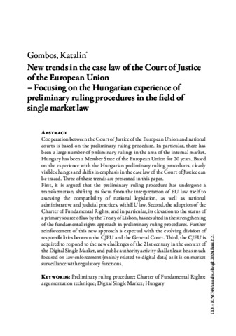 Cooperation between the Court of Justice of the European Union and national courts is based on the preliminary ruling procedure. In particular, there has been a large number of preliminary rulings in the area of the internal market. Hungary has been a Member State of the European Union for 20 years. Based on the experience with the Hungarian preliminary ruling procedures, clearly visible changes and shifts in emphasis in the case law of the Court of Justice can be traced. Three of these trends are presented in this paper. First, it is argued that the preliminary ruling procedure has undergone a transformation, shifting its focus from the interpretation of EU law itself to assessing the compatibility of national legislation, as well as national administrative and judicial practices, with EU law. Second, the adoption of the Charter of Fundamental Rights, and in particular, its elevation to the status of a primary source of law by the Treaty of Lisbon, has resulted in the strengthening of the fundamental rights approach in preliminary ruling procedures. Further reinforcement of this new approach is expected with the evolving division of responsibilities between the CJEU and the General Court. Third, the CJEU is required to respond to the new challenges of the 21st century in the context of the Digital Single Market, and public authority activity shall at least be as much focused on law enforcement (mainly related to digital data) as it is on market surveillance with regulatory functions.