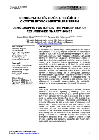 Szűcs, Róbert Sándor and Bakosné Kiss, Virág Ágnes (2025) Demográfiai tényezők a felújított okostelefonok megítélése terén. GRADUS, 12 (2). pp. 1-14. ISSN 2064-8014