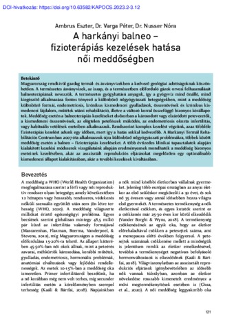 Ambrus, Eszter and Varga, Péter and Nusser, Nóra (2023) A harkányi balneo : fizioterápiás kezelések hatása női meddőségben. KAPOCS, 6 (2-3). pp. 121-126. ISSN 1588-7227