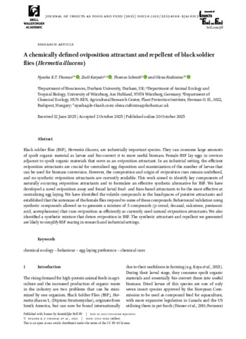 Thomas, Nyasha K.T. and Kárpáti, Zsolt and Schmitt, Thomas and Riabinina, Olena (2025) A chemically defined oviposition attractant and repellent of black soldier flies (Hermetia illucens). JOURNAL OF INSECTS AS FOOD AND FEED. pp. 1-13. ISSN 2352-4588