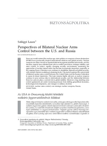 Since our world entered the nuclear age, state policies on weapons of mass destruction (WMD) have profoundly shaped international relations and global security. Nuclear weapons are often viewed as essential deterrents against potential adversaries, and for decades, experts have debated their role in conflict prevention, strategic stability, and arms control. In today’s rapidly changing security environment, examining the approaches of nuclear-armed states has become increasingly important, especially as the ongoing Russo–Ukrainian war continues to destabilise regional and global security, with nuclear rhetoric escalating to alarming levels. This study examines the current state of bilateral nuclear arms control between the United States and the Russian Federation to assess its future trajectories. This topic remains highly relevant, as nuclear weapons continue to pose serious risks to international security, and the relationship between these two powers plays a central role in global stability. Moreover, long-standing arms control agreements are under increasing pressure from shifting geopolitical dynamics, technological developments, and changes in military doctrine. | Mióta világunk belépett a nukleáris korszakba, a tömegpusztító fegyverekkel kapcsolatos állami politikák alapvetően átalakították a nemzetközi kapcsolatokat és a globális biztonságot. A nukleáris fegyvereket gyakran tekintik alapvető elrettentő eszköznek a potenciális ellenfelekkel szemben, és a szakértők évtizedek óta vitatják szerepüket a konfliktusmegelőzésben, a stratégiai stabilitásban és a fegyverzetellenőrzésben. Napjaink gyorsan változó biztonsági környezetében egyre fontosabbá vált a nukleáris fegyverekkel rendelkező államok szakpolitikáinak vizsgálata, mivel a jelenleg zajló orosz–ukrán háború továbbra is destabilizálja a regionális és globális biztonságot, továbbá a nukleáris retorika riasztó szintre eszkalálódott. Ez a tanulmány az Egyesült Államok és az Oroszországi Föderáció közötti kétoldalú nukleáris fegyverzetellenőrzés jelenlegi helyzetét vizsgálja, hogy felmérje jövőbeli pályáját. Ez a téma változatlanul rendkívül aktuális, mivel a nukleáris fegyverek továbbra is komoly kockázatot jelentenek a nemzetközi biztonságra, és a két hatalom közötti kapcsolat központi szerepet játszik a globális stabilitásban. Ráadásul a régóta fennálló fegyverzetellenőrzési megállapodások a változó geopolitikai dinamika, a technológiai fejlődés és a katonai doktrínák változásai miatt növekvõ nyomás alatt állnak.