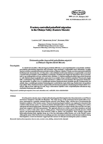 Over the past two decades, traces of hydrocarbon-bearing paleofluid migration have been detected in several Triassic and Jurassic formations in the Mecsek Mountains. This study focuses on the easternmost known hydrocarbon occurrence, represented by a partially cemented fracture network in the Óbánya Valley, with the aim of reconstructing the formation conditions of the fracture system. Classical structural geological methods were employed to characterize the evolution of this fracture system. As a result, two distinct deformation phases were identified: a) a folding event, and b) a subsequent left-lateral displacement. Theoretical orientation of fractures associated with the observed folds were determined and compared with field measurements. This approach allowed us to define several fault orientations and fault breccias, as well as to link calcite veins to a folding process. Fluid inclusion petrography revealed the presence of both aqueous and hydrocarbon-bearing fluid inclusions within six distinct vein generations. These findings suggest that hydrocarbon-bearing fluids migrated along one of the four deformation-related fracture sets in this fracture system. Although the nature of the fluid inclusion assemblages provides only limited constraints on the thermal conditions during fluid migration, several vein structures suggest episodic increases in fluid pressure during the system’s evolution. | Az elmúlt két évtizedben a Mecsek-hegység területén több triász és jura képződményben azonosítottak szénhidrogén-tartalmú paleofluidum-migrációra utaló nyomokat. Jelen tanulmány a legkeletebbi ismert előfordulást vizsgálja, amelyet a részben cementált törésrendszerek képviselnek az Óbányai-völgyben. Célunk ezen törésrendszerek kialakulási körülményeinek rekonstrukciója volt. Klasszikus szerkezetföldtani módszereket alkalmazva megkíséreltük azonosítani a repedésrendszert kialakító szerkezetfejlődési eseményeket. Eredményeink alapján két deformációs fázist azonosítottunk: a) egy redőképződést és b) egy ezt követő, balos eltolódást. A völgyben megfigyelt redőhöz kapcsolódó kőzetrések és vetők elméleti irányait meghatároztuk, majd ezeket összevetettük a terepi orientációs adatokkal. Elemzéseink alapján több, a redőződéshez kapcsolódó törési irányt, kalciteret és vetőbreccsát azonosítottunk. Hat érgeneráció fluidumzárvány-petrográfiai vizsgálata vizes és szénhidrogén-tartalmú fluidumzárványok jelenlétét igazolta. Eredményeink arra utalnak, hogy a szénhidrogén-tartalmú fluidummigráció a redőződéshez kapcsolódó négy elméleti törési sík egyikéhez kapcsolható. Noha a fluidumzárványok csupán korlátozott információt nyújtanak a fluidummigráció hőmérsékleti viszonyairól, több érszöveti sajátosság arra utal, hogy a törésrendszer fejlődése során a képződményben időszakosan megemelkedett fluidumnyomás uralkodott.