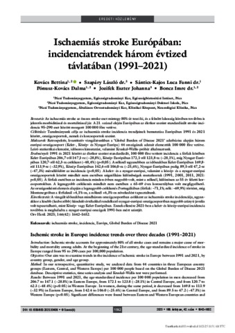 Kovács, Bettina and Szapáry, László and Sántics-Kajos, Luca Fanni and Pónusz-Kovács, Dalma and Jozifek, Eszter Johanna and Boncz, Imre (2025) Ischaemiás stroke Európában: incidenciatrendek három évtized távlatában (1991- 2021) = Ischemic stroke in Europe: incidence trends over three decades (1991–2021). ORVOSI HETILAP, 166 (42). pp. 1642-1652. ISSN 0030-6002
