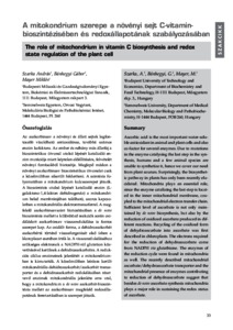Az aszkorbinsav a növényi és állati sejtek legfontosabb vízoldható antioxidánsa, továbbá számos enzim kofaktora. Az ember és néhány más állatfaj a bioszintetikus útvonal utolsó lépését katalizáló enzim mutációja miatt képtelen elôállítására, felvételét növényi forrásokból biztosítja. Meglepô módon a növényi aszkorbinsav bioszintetikus útvonalat csak a közelmúltban sikerült felderíteni. A szintézis folyamatában a mitokondrium kulcsszerepet játszik. A bioszintézis utolsó lépését katalizáló enzim (Lgalaktono-1,4-lakton dehidrogenáz) a mitokondrium belső membránjában található, szoros kapcsolatban a mitokondriális elektrontranszferrel. Amegfelelő aszkorbinsavszint biztosításában a de novo bioszintézis mellett a különbözô reakciók során oxidálódott aszkorbinsav visszaredukálása is fontos szerepet kap. Az oxidált forma, a dehidroaszkorbát aszkorbáttá történő visszaforgatását első ízben a kloroplaszt esetében írták le. Avisszaredukálásához szükséges elektronok a NADPH-ról glutation közvetítésével kerülnek a dehidroaszkorbátra. Aredukciós ciklus enzimeinek jelenlétét a mitokondriumban is kimutatták. A közelmúltban leírásra került mitokondriális dehidroaszkorbát/aszkorbát transzporter és a dehidroaszkorbát redukálásában részt vevő enzimek mitokondriális jelenléte arra utal, hogy a mitokondrium a de novo aszkorbát-bioszintézis mellett az aszkorbinsav megfelelő redoxállapotának fenntartásában is szerepet játszik.