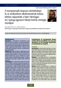 Bevezetés: A transperinealis prosztatabiopszia egyre gyakrabban alkalmazott eljárás a prosztatarák diagnosztikájában. Az eljárás során felmerülő szövődmények, valamint az antibiotikumhasználat hatékonyságának vizsgálata kulcsfontosságú a betegek biztonsága érdekében. Nemzetközi tanulmányok eltérő eredményeket mutatnak az antibiotikumprofilaxis hatékonyságáról. Módszerek: A Fejér Vármegyei Szt. György Egyetemi Oktató Kórház Urológiai Osztályán 2023 és 2025 között 296 transperinealis biopsziát végeztünk. Az esetek egy részében antibiotikumot alkalmaztunk, míg más esetekben nem, minden esetben betadine-os bőrfertőtlenítést végeztünk. Vizsgáltuk a szövődmények gyakoriságát és jellegét mindkét randomizált csoportban. Eredmények: 114 beteg esetében alkalmaztunk antibiotikumot. 26 esetben volt pozitív a biopszia előtt elvégzett vizelettenyésztés, ebből 1 betegnél jelentkezett valamilyen szövődmény (lásd alább). 3 esetben (2,63%) jelentkeztek sürgősségi betegellátó osztályon (SBO-n) vérvizelés miatt, ebből egy sem igényelt osztályos felvételt. 3 esetben (2,63%) (1 pozitív vizelettenyésztés, aki dupla J (DJ) katétert viselt) tapasztaltunk fertőzéses szövődményt, ebből egy sem igényelt osztályos felvételt, illetve 2 esetben (1,75%) jelentkeztek vizeletelakadás miatt. 182 esetben nem használtunk antibiotikumot. 12 esetben volt pozitív a biopszia előtt elvégzett vizelettenyésztés, ebből egy betegnél sem jelentkezett szövődmény. 7 esetben (3,85%) jelentkeztek az SBO-n vérvizelés miatt, ebből 1 igényelt osztályos felvételt, disszeminált intravaszkuláris koaguláció (DIC) miatt. 2 esetben (1,10%) tapasztaltunk fertőzéses szövődményt, ebből egy sem igényelt osztályos felvételt. 3 eset (1,65%) jelentkezett vizeletelakadás miatt, 1 esetben (0,55%) pedig perkután nephrostomia (PCN) behelyezése volt szükséges. Megbeszélés: A nemzetközi tanulmányok azt mutatják, hogy az antibiotikumprofilaxis nem mindig eredményez alacsonyabb fertőzési arányt. A vizsgálatban a fertőzési arányok 0,69% és 0,47% voltak az antibiotikumot kapott és nem kapott csoportokban. Eredményeink szerint a fertőzési arány alacsonyabb volt antibiotikum nélkül (1,10%), ami összhangban áll a nemzetközi adatokkal. Következtetés: Transperinealis biopszia során alkalmazott antibiotikus profilaxis nem csökkenti a szövődmények arányát. | Introduction: Transperineal prostate biopsy is an increasingly utilized procedure in prostate cancer diagnostics. Investigation of complications arising during the procedure and the effectiveness of antibiotic use is crucial for patient safety (3). International studies show varying results regarding the effectiveness of antibiotic prophylaxis (2). Methods: At the Urology Department of Székesfehérvár Hospital, 296 transperineal biopsies were performed between 2023 and 2025. Antibiotics were administered in some cases while not in others, with Betadine skin disinfection performed in all cases. We examined the frequency and nature of complications in both randomized groups. Results: Antibiotics were administered in 114 patients. Prebiopsy urine culture was positive in 26 cases, with complications occurring in 1 patient. Three cases (2.63%) presented to the emergency department with hematuria, none requiring hospital admission. Infectious complications occurred in 3 cases (2.63%) (including 1 positive urine culture patient with a double-J catheter), none requiring hospital admission, and urinary retention occurred in 2 cases (1.75%). In 182 cases, no antibiotics were used. Pre-biopsy urine culture was positive in 12 cases, with no complications in any of these patients. Seven cases (3.85%) presented to the emergency department with hematuria, with 1 requiring hospital admission due to disseminated intravascular coagulation (DIC). Infectious complications occurred in 2 cases (1.10%), none requiring hospital admission. Three cases (1.65%) presented with urinary retention, and percutaneous nephrostomy (PCN) insertion was necessary in 1 case (0.55%). Discussion: International studies demonstrate that antibiotic prophylaxis does not always result in lower infection rates (3, 4). In our study, infection rates were 0.69% and 0.47% in the antibiotic-treated and non-treated groups respectively. Our results show lower infection rates without antibiotics (1.10%), consistent with international data. Conclusion: Antibiotic prophylaxis during transperineal biopsy does not reduce complication rates. The effectiveness of antibiotics in transperineal biopsy remains unclear. Reducing antibiotic use is desirable to prevent the spread of antibiotic-resistant bacteria. Further research is necessary to determine optimal prophylaxis strategies.