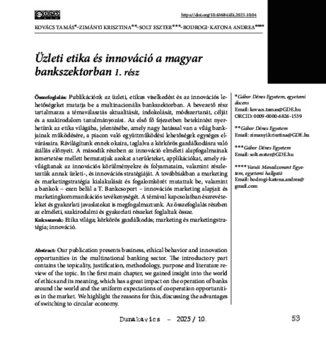 Kovács, Tamás and Zimányi, Krisztina and Solt, Eszter and Bodrogi-Katona, Andrea (2025) Üzleti etika és innováció a magyar bankszektorban 1. rész. DUNAKAVICS, 13 (10). pp. 53-66. ISSN 2064-5007