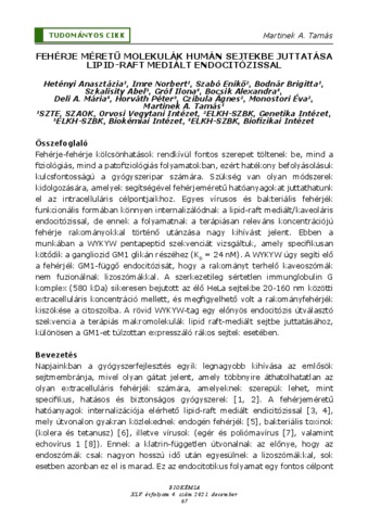 Hetényi, Anasztázia and Imre, Norbert and Szabó, Enikő and Bodnár, Brigitta and Szkalisity, Ábel and Gróf, Ilona and Bocsik, Alexandra and Deli, A. Mária and Horváth, Péter and Czibula, Ágnes and Monostori, Éva and Martinek, A. Tamás (2021) Fehérje méretű molekulák humán sejtekbe juttatása Lipid-Raft mediált endocitózissal. BIOKÉMIA: A MAGYAR BIOKÉMIAI EGYESÜLET FOLYÓIRATA, 45 (4). pp. 67-83. ISSN 0133-8455
