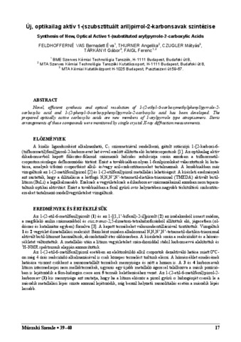 Feldhofferné Vas, Bernadett Éva and Thurner, Angelika and Czugler, Mátyás and Tárkányi, Gábor and Faigl, Ferenc (2007) Új, optikailag aktív 1-(szubsztituált aril)pirrol-2-karbonsavak szintézise. MŰSZAKI SZEMLE (EMT) (39-40). pp. 17-19. ISSN 1454-0746