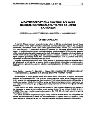 A szerzők, Magyarországon tenyésztett angol telivér (n=58) és amerikai ügető (német, illetve francia hátterű; n=52) fajták vérmintáit analizálták származásellenőrzés céljából. Az ellenőrzött rendszerek a következők voltak: alpha-1-beta glycoprotein (A1B), albumin (Al), karboxilészteráz (Es), transzferrin (Tf), D vitamin kötő fehérje (Gc), valamint a D vércsoport rendszer (EAD). A vércsoport és biokémiai polimorfizmus meghatározásához poliakrilamidgél (PAGE) technika, valamint vörösvértest vércsoport-analízis módszerek kerültek alkalmazásra. A kapott eredmények alapján a két fajta között eltérés volt megfigyelhető, a D vércsoport rendszer, valamint a Tf és az Al lókuszok egyes alléljának gyakorisága között. Más rendszerek esetében (Es, A1B, GC polimorf rendszerek) viszont nem mutatkozott különbség a két fajta között. A munka során bebizonyosodott, hogy a több faktorra és alrendszerre alapozott analitikai eljárások alkalmasak a két fajta és az azokon belüli egyedek közötti különbségek meghatározására. Segítségükkel a génáramlás, valamint a beltenyésztettség becslése érdekében is hasznos adatok születtek.