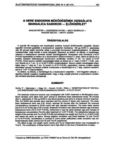 A szerzők 48 mangalica kan tesztikuláris endokrin funkciót GnRH-teszttel vizsgálták. Minden egyedtől vérmintát gyűjtöttek a tesztoszteron alapérték méréséhez. 100 pg GnRH iv. applikálása után 90 perccel újabb vérmintát vettek a provokált hormonszint meghatározásához. Az állatokat ivartalanították, majd mérték a herék térfogatát. Elemezve az életkor, az élősúly, a heretérfogat, valamint a tesztoszteron termelés közötti összefüggéseket. Közepesen erős korrelációt (r=0,47 P<0,05) tapasztaltak az életkor és a tesztoszteron alapkoncentráció (T alap), illetve az élősúly és a kezelés hatására bekövetkezett hormonszint emelkedés mértéke (T em. %) között (r=-0,57 P<0,05). Közel azonos mértékű összefüggést láttak az élősúly és a T alap (r=0,50 P < 0,05), valamint élősúly és a T em. % (r=-0,58 P<0,05) vonatkozásában. Szoros negatív összefüggést állapítottak meg a T alap és T em. % között (r=-0,75 P<0,05), ugyanakkor, számos irodalmi adattal ellentétben gyenge korrelációs értékek mutatkoztak a heretérfogat és a T alap, valamint heretérfogat és a T em. % kapcsolatában. Az életkor, az élősúly, a heretérfogat és a tesztoszteron alapérték — mint független változók — együttes hatását vizsgálva megállapították, hogy a négy vizsgált jellemző a tesztoszteron emelkedés mértékét jelentősen befolyásolja.