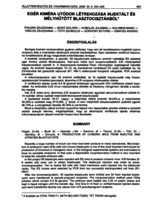 Biológiai kísérleti rendszerekben gyakran előfordul, hogy nem áll rendelkezésre megfelelő számú recipiens állat a kísérletben létrehozott embriók beültetéséhez. Ilyen esetekben rendkívül hasznos, ha rendelkezésre áll egy megbízható embríótárolási rendszer. A kísérleti rendszerben, a szerzők, 69 blasztociszta stádiumú embriót injektáltak ES sejtekkel egér kiméra utódok létrehozására. Hat-nyolc hetes korú szuperovuláltatott, ICR nőstényekből blasztocisztákat nyertek ki. A blasztociszta-injektálást Piezo mikroinjektor segítségével hajtották végre. Az embriók blasztocöljébe 10-12, ép membránnal rendelkező ES sejtet injektáltak be. Az ES-klónokat két génkiütött sejtvonal (R1, HM-1) elektroporált kiónjaiból válogatták, PCR analízist követően. A mikromanipuláció után 35 embriót verifikáltak, és 34 injektált blasztocisztát még frissen, vazektomizált hímekkel pároztatott, álvemhes ICR recipiens nőstényekbe ültettek. A vitrifikációs eljárás során 6,5 M glicerolt tartalmazó úgynevezett VS3 vitrifikációs oldatot használtak. Az embriókat 0,25 ml-es műszalmákba töltötték és folyékony nitrogénben tárolták a beültetés napjáig. Hat, 6-8. hetes korú, álvemhes ICR recipiens nősténybe, egyoldali uterus-transzferrel ültettek 8- 14 injektált, illetve injektált mélyhűtött-felolvasztott blasztocisztát. A beültetést követő 19-21. napon, a mélyhűtés nélküli embriók 38,24%-a, a mélyhűtöttek 39,29%-a született meg (P>0,005, % teszt). A nem mélyhűtött blasztocisztákból született egerek 46,15%-a, a nitrogénben tároltak 36,36%-a volt kiméra. Mivel a mélyhűtés nélküli kontroll csoporthoz képest nem tapasztaltak jelentős eltérést a született utódok arányát tekintve, megállapítható, hogy az alkalmazott vitrifikációs eljárás alkalmas mikromanipuláción átesett embriók hosszú távú tárolására.