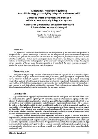 Szász, Imre and Ros, Victor (2009) A háztartási hulladékok gyűjtése és szállítása egy gazdaságilag integrált rendszeren belül. MŰSZAKI SZEMLE (EMT) (45). pp. 31-34. ISSN 1454-0746