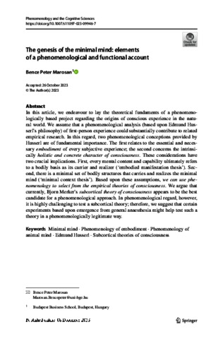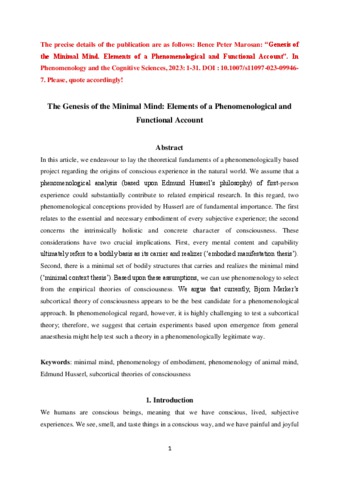 Marosán, Bence Péter (2023) The Genesis of the Minimal Mind: Elements of a Phenomenological and Functional Account. PHENOMENOLOGY AND THE COGNITIVE SCIENCES. pp. 1-31. ISSN 1572-8676