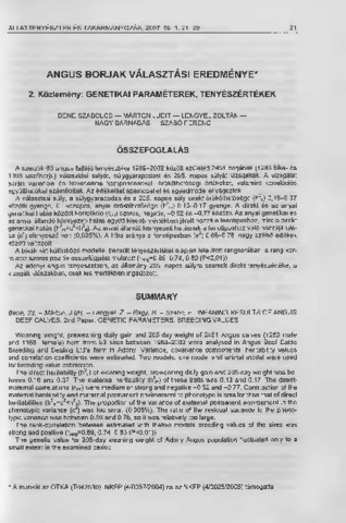A szerzők 63 angus fajtájú tenyészbika 1989-2002 között született 2451 borjának (1283 bika- és 1168 üszőborjú) választási súlyát, súlygyarapodást és 205. napos súlyát vizsgálták. A vizsgálat során variancia és kovariancia komponenseket, örökölhetöségi értékeket, valamint korrelációs együtthatókat számítottak. Az értékelést apamodellel és egyedmodellel végezték. A választási súly, a súlygyarapodás és a 205. napos súly direkt örökölhetősége (h2d) 0,16-0,37 közötti gyenge, ill. közepes, anyai örökölhetősége (h2m) 0,13-0,17 gyenge. A direkt és az anyai genetikai hatás közötti korreláció (rdm) szoros, negatív, -0,52 és -0,77 közötti. Az anyai genetikai és az anyai állandó környezeti hatás együtt kisebb mértékben járult hozzá a fenotípushoz, mint a direkt genetikai hatás (h2m+c2<h2d). Az anyai állandó környezeti hatásnak a fenotípushoz való hozzájárulása (c2) elenyésző volt (0,005%). A hiba aránya a fenotípusban (e2) 0,66-0,78, nagy szélső értékek között változott. A bikák két különböző modellel becsült tenyészértékei alapján felállított rangsorában, a rang korreláció szoros pozitív összefüggést mutatott (rrang=0,89, 0,74, 0,83 (P<0,01)). Az adonyi angus tenyészetben, az állomány 205. napos súlyra számolt direkt tenyészértéke, a vizsgált időszakban, csak kis mértékben ingadozott.