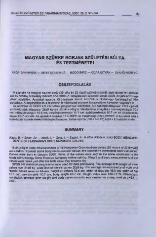 A szerzők 48 magyar szürke borjú (26 bika és 22 üsző) születési súlyát, testméreteinek alakulását és néhány testarány indexét értékelték. A vizsgálatban szereplő borjak 2005. év január hónapjában születtek. Anyjukat azonos körülmények között tartották a Hortobágyi Génmegőrző Kht. gulyáiban. A súlymérést és a testméret felvételezést a borjak felszáradását követően végezték el. Az adatokat az SPSS 9.0 statisztikai programmal értékelték. A bikaborjak átlagosan 31 ±9 kg-mal, az üszőborjak átlagosan 28±8 kg-mal jöttek a világra. Mindkét ivar átlagában marmagasságuk 70,4 cm, vállszélességük 16,8 cm, csípöszélességük 16,1 cm, szárkörméretük 10,7 cm és törzshosszúságuk 63,7 cm volt. Az újszülött borjakat 111-109%-os magassági-index jellemzi. A születési súly a különböző testméretekkel többnyire közepes, illetve szoros (r=0,41-0,87) pozitív korrelációt mutat.
