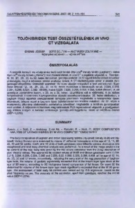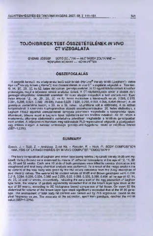A szerzők könnyű- és középnehéz testű tojóhibridek (Hy-Line® Variety W-98 („Leghorn”), illetve Hy-Line® Variety Brown („Barna’’)) test-összetételének in vivő CT vizsgálatát végezték el. Tizenkettő, 14., 20., 25., 30. és 52. hetes életkorban, genotípusonként 10-10 egyed felvételezését követően próbavágás, majd a teljestest kémiai analízise történt. A CT-képfeldolgozás során a pixelek röntgensugár- elnyelödésí értékeiből számított HU-index alapján megadták a test zsírtartalmát. Ezen index értékek 12., 14., 20., 25., 30. és 52. hetes életkorban a következők voltak: 0,228, 0,215 0,294, 0,296, 0,324, 0,392 (W-98), illetve 0,228, 0,220, 0,268, 0,338, 0,356, 0,404 (Brown). A két genotípus zsírtartalma között, a 25. és a 30. héten, szignifikáns volt a különbség. A zsírszövet beépülésének 3-dimenziós hisztogramokon alapuló összehasonlításakor, 20. hetes életkorban, a Leghorn típusú egyedek ivarszerveinek térfogata jelentősen meghaladta a középnehéz típusú állományét, jelezve ezzel a Leghorn típus tojástermelésének korábbi indulását. Az 52. héten a középnehéz állomány abdominális zsirtartalma jelentősen meghaladta a W-98-as genotípusban mért értéket. A teljestest-zsírtartalom meghatározását PLS-regresszióval végezték a pixelgyakorisági értékek alapján. A becslés pontossága, genotípustól függetlenül, elérte az r=0,98-as értéket (SEP=1,23%).