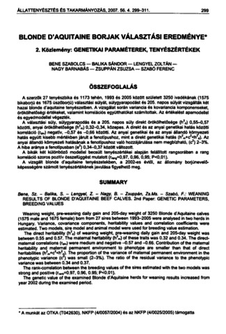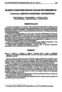 A szerzők 27 tenyészbika és 1173 tehén, 1993 és 2005 között született 3250 ivadékának (1575 bikaborjú és 1675 üszőborjú) választási súlyát, súlygyarapodást és 205. napos súlyát vizsgálták két hazai blonde d’aquitaine tenyészetben. A vizsgálat során variancia és kovariancia komponenseket, örökölhetőségi értékeket, valamint korrelációs együtthatókat számítottak. Az értékelést apamodellel és egyedmodellel végezték. A választási súly, súlygyarapodás és a 205. napos súly direkt örökölhetősége (h2d) 0,55-0,57 közötti, anyai örökölhetősége (h2m) 0,32-0,34, közepes. A direkt és az anyai genetikai hatás közötti korreláció (rdm) negatív, -0,57 és -0,66 közötti. Az anyai genetikai és az anyai állandó környezeti hatás együtt kisebb mértékben járult a fenotípushoz, mint a direkt genetikai hatás (h2m+c2<h d). Az anyai állandó környezeti hatásának a fenotípushoz való hozzájárulása nem megbízható, (c2) 2-3%. A hiba aránya a fenotípusban (e2) 0,34-0,37 között változott. A bikák két különböző modellel becsült tenyészértékei alapján felállított rangsorában a rang korreláció szoros pozitív összefüggést mutatott (^= 0 ,9 7 , 0,96, 0,95; P<0,01). A vizsgált blonde d’aquitaine tenyészetekben, a 2002-es évtől, az állomány borjúnevelőképességére számolt tenyészértékének javulása figyelhető meg.