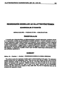 A szerzők jelen közleményükben az állattenyésztésben használt regressziós modelleket tekintik át. A regressziós modellek az ismételhetőségi modellből alakultak ki. A két fő változatuk a fix és a random regressziós modell. Előbbi esetében a fix hatásokat, míg az utóbbinál a random hatásokat is regresszióval becsüljük. A becslés során különböző függvényeket alkalmazunk a fix és véletlen hatások modellezésére. A leggyakrabban a Legendre-polinomokat használjuk. A tejhasznosítású szarvasmarhák termelési adataira gyakran használt két függvény a Wilmink- és az Ali-Schaefferféle függvény. A regressziós modellek minden olyan termelési tulajdonságra alkalmazhatók, amelyek ismétlődve fejeződnek ki.