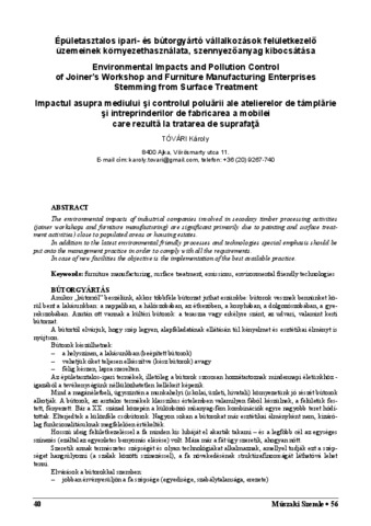 Tóvári, Károly (2011) Épületasztalos ipari- és bútorgyártó vállalkozások felületkezelő üzemeinek környezethasználata, szennyezőanyag kibocsátása. MŰSZAKI SZEMLE (EMT) (56). pp. 40-44. ISSN 1454-0746
