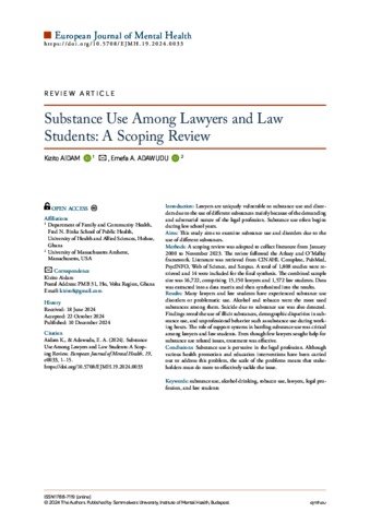Aidam, Kizito and Adawudu, Emefa A. (2024) Substance Use Among Lawyers and Law Students: A Scoping Review. EUROPEAN JOURNAL OF MENTAL HEALTH, 19. pp. 1-15. ISSN 1788-4934 (print); 1788-7119 (online)