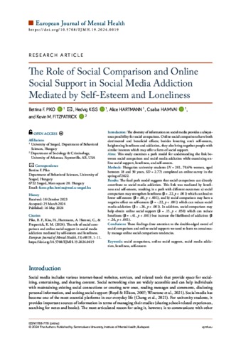 F. Pikó, Bettina and Kiss, Hedvig and Hartmann, Alice and Hamvai, Csaba and M. Fitzpatrick, Kevin (2024) The Role of Social Comparison and Online Social Support in Social Media Addiction Mediated by Self-Esteem and Loneliness. EUROPEAN JOURNAL OF MENTAL HEALTH, 19. pp. 1-11. ISSN 1788-7119