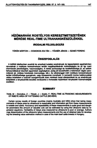 Török, Márton and Domokos, Zoltán and Tőzsér, János and Szabó, Ferenc (2008) Hízómarhák rostélyos keresztmetszetének mérése real-time ultrahangkészülékkel. Irodalmi feldolgozás. ÁLLATTENYÉSZTÉS ÉS TAKARMÁNYOZÁS, 57 (2). pp. 147-160. ISSN 0230-1814