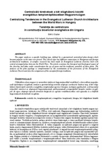 Cikkünkben olyan magyar és nemzetközi építészeti hagyományokkal rendelkező, a korszakban megsokasodó épülettípust vizsgálunk, amelyet a geometriailag centrális alaprajzi szerkesztés határoz meg. A két világháború között épült centrális evangélikus templomokat egyrészt liturgiai, teológiai aspektusból, a térhasználat irányából, másrészt az alaprajzok hagyományainak, párhuzamainak szempontjából komplex módon vizsgáljuk. Az egyes alaprajzi típusok elemzését kiegészíti az egyházi rendelkezésekhez való igazodás és a külföldi hagyományok átvételének vizsgálata.