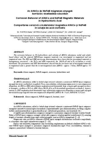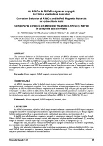 Az AlNiCo (alumínium, nikkel és kobalt alapú ötvözet) valamint a szinterezett NdFeB típusú mágneses anyagok korróziós viselkedését vizsgáltuk 1%-os sósavoldatban, telítettségig mágnesezett, és nem mágnesezett állapotban. Az XRD és SEM mikrószkópiás meghatározások kimutatták, hogy a megvizsgált anyagok szerkezete homogén – ezekben a FeCo és AlNi, illetve Nd2Fe14B és α Fe krisztalitok egyenletesen oszlanak el. A gravimetriás és XRF meghatározások kimutatták, hogy telítettségig mágnesezett állapotban a megvizsgált anyagok korróziósebessége nagyobb mint nem mágnesezett állapotban (AlNiCo kb. 3-szor, NdFeB kb. 4,3-szor).