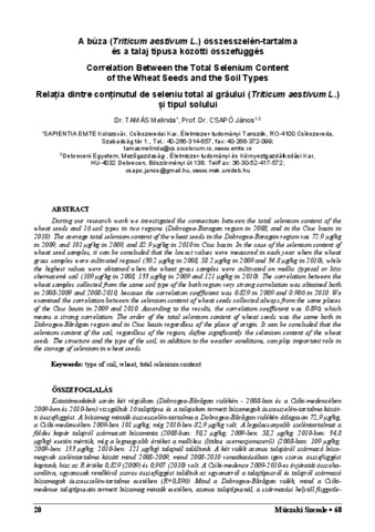 Kutatómunkánk során két régióban (Dobrogea-Bărăgan vidékén - 2008-ban és a Csíki-medencében 2009-ben és 2010-ben) vizsgáltuk 16 talajtípus és a talajokon termett búzamagok összesszelén-tartalma közötti összefüggést. A búzamag minták összesszelén-tartalma a Dobrogea-Bărăgan vidékén átlagosan 72,9 μg/kg, a Csíki-medencében 2009-ben 101 μg/kg, míg 2010-ben 82,9 μg/kg volt. A legalacsonyabb szeléntartalmat a földes kopár talajról származott búzaminta (2008-ban: 30,2 μg/kg; 2009-ben: 58,2 μg/kg; 2010-ben: 34,8 μg/kg) esetén mértük, míg a legnagyobb értéket a mollikus (litikus csernozjomszerű) (2008-ban: 109 μg/kg; 2009-ben: 133 μg/kg; 2010-ben: 121 μg/kg) talajnál találtunk. A két vidék azonos talajáról származó búzamagvak szeléntartalma között mind 2008-2009, mind 2008-2010 vonatkozásában igen szoros összefüggést kaptunk, hisz az R értéke 0,829 (2009) és 0,907 (2010) volt. A Csíki-medence 2009-2010-es évjáratát összehasonlítva, ugyancsak rendkívül szoros összefüggést találtuk az ugyanarról a talajtípusról és talajról származó búzamagok összesszelén-tartalma esetében (R=0,896). Mind a Dobrogea-Bărăgan vidék, mind a Csíkimedence talajtípusain termett búzamag minták esetében, azonos talajtípusnál, a származási helytől függetlenül, ugyanazt a sorrendet kaptuk, a búzamag minták összesszelén-tartalmát illetően. Levonhatjuk tehát azt a következtetést, hogy a talaj Se-tartalma, tájegységtől függetlenül, szignifikáns mértékben megszabja a búzamag szeléntartalmát. Az időjárási körülmények mellett a talaj szerkezete és típusa fontos szerepet játszhat a szelén búzamagban való elraktározódásában.
