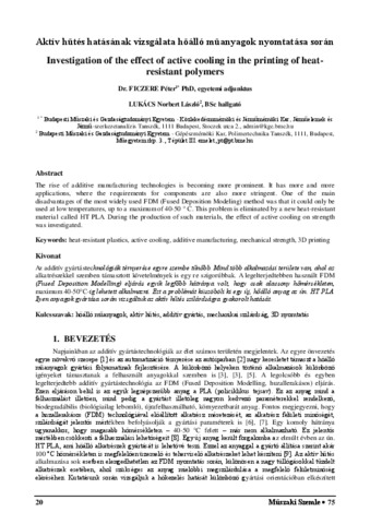Ficzere, Péter and Lukács, Norbert László (2020) Aktív hűtés hatásának vizsgálata hőálló műanyagok nyomtatása során. MŰSZAKI SZEMLE (EMT) (75). pp. 20-24. ISSN 1454-0746