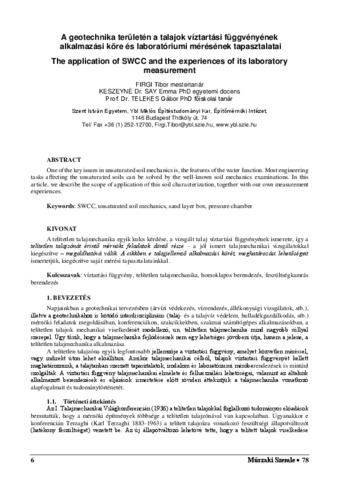 Firgi, Tibor and Keszeyné Dr. Say, Emma and Telekes, Gábor (2021) A geotechnika területén a talajok víztartási függvényének alkalmazási köre és laboratóriumi mérésének tapasztalatai. MŰSZAKI SZEMLE (EMT) (78). pp. 6-15. ISSN 1454-0746