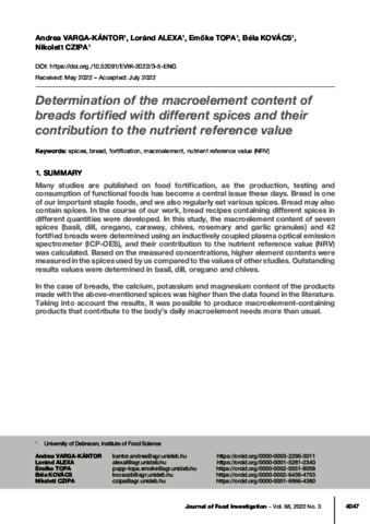 Varga-Kántor, Andrea and Alexa, Loránd and Topa, Emőke and Kovács, Béla and Czipa, Nikolett (2022) Determination of the macroelement content of breads fortified with different spices and their contribution to the nutrient reference value. ÉLELMISZERVIZSGÁLATI KÖZLEMÉNYEK, 68 (3). pp. 4047-4057. ISSN 2676-8704 (print); 0422-9576 (online)