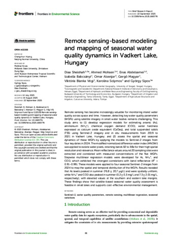 Sheishah, Diaa Elsayed Hamed Abdallah Hamed and Mohsen, Ahmed and Abdelsamei, Enas and Babcsányi, Izabella and Alsenjar, Omar and Magyar, Gergő and Blanka, Viktória and Solymos, Karolina and Sipos, György (2025) Remote sensing-based modeling and mapping of seasonal water quality dynamics in Vadkert Lake, Hungary. FRONTIERS IN ENVIRONMENTAL SCIENCE, 13. No. 1665776. ISSN 2296-665X