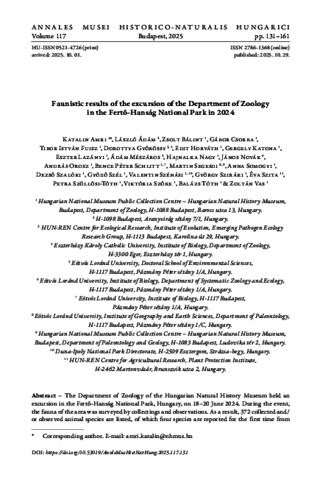 Amri, Katalin and Ádám, László and Bálint, Zsolt and Csorba, Gábor and Fuisz, Tibor and Győrössy, Dorottya and Horváth, Edit and Katona, Gergely Péter and Deákné Lazányi-Bacsó, Eszter Ágnes and Mészáros, Ádám and Nagy, Hajnalka and Novák, János and Orosz, András and Schlitt, Bence Péter and Segesdi, Martin and Somogyi, Anna and Szalóki, Dezső and Szél, Győző and Szénási, Valentin and Sziráki, György and Szita, Éva and Szöllősi-Tóth, Petra and Szőke, Viktória and Tóth, Balázs Ferenc and Vas, Zoltán (2025) Faunistic results of the excursion of the Department of Zoology in the Fertő-Hanság National Park in 2024. ANNALES MUSEI HISTORICO-NATURALIS HUNGARICI, 117. pp. 131-161. ISSN 0521-4726