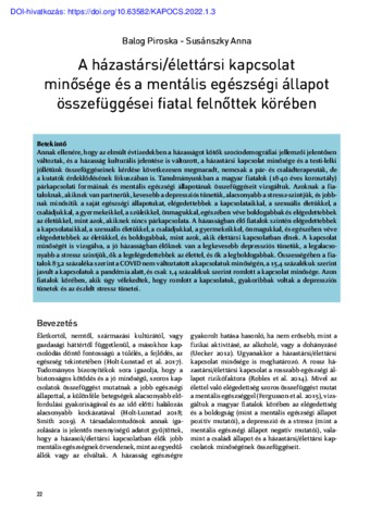 Balog, Piroska and Susánszky, Anna (2022) A házastársi/élettársi kapcsolat minősége és a mentális egészségi állapot összefüggései a fiatal felnőttek körében. KAPOCS, 5 (1). pp. 22-31. ISSN 1588-7227