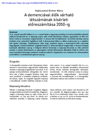 A 20. század második felében és a 21. század elején a népesség számában és korösszetételében jelentős változás következett be. A népesség száma 1980. évtől fokozatosan csökken, ugyanakkor az idős emberek száma és részaránya megnövekedett. A „hosszú élet forradalmának” nevezhető jelenség számos területet érint, melyekkel foglalkozni kell. A demenciával élőket az ellátó rendszernek és a családoknak ápolni szükséges. Tanulmányom célja, hogy kísérletet tegyen a demenciával élők számának nagyságának, korösszetételének meghatározására és előreszámítással megbecsülje a demens betegek számának alakulását 2050-ig. A dolgozat először bemutatja a népesség létszámát, az idős emberek számát, a várható élettartamok, az egészségben várható élettartamok alakulását. Majd az OECD a demens személyek lehetséges arányaira vonatkozó adatait is figyelembe véve mutatom be a demenciában szenvedőkre a számításaimat egészen 2050-ig. | In the second half of the 20th century and the beginning of the 21st century, there have been significant changes in the size and age composition of the population. Since 1980, the population has been gradually declining, while the number and proportion of elderly people have increased. This phenomenon, which can be described as the "revolution of long life," affects many areas that require attention. People living with dementia need to be cared for by both the healthcare system and families. The aim of my study is to attempt to determine the number and age composition of people living with dementia and to project the development of the number of dementia patients up to 2050. The paper first presents the population size, the number of elderly people, life expectancy, and healthy life expectancy trends. Then, considering the OECD data on the possible proportions of people with dementia, I present my calculations for those suffering from dementia up to 2050.