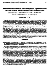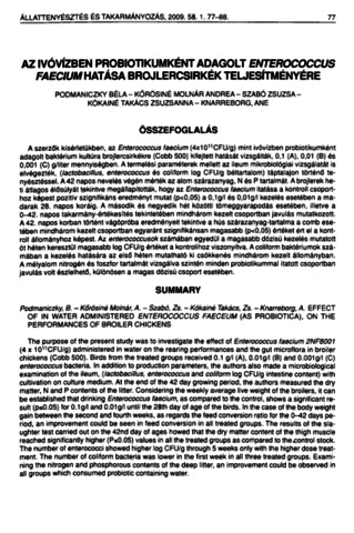 Aszerzők kísérletükben, az Enterococcus faecium (4x1011CFU/g) mint ivóvízben probiotikumként adagolt baktérium kultúra brojlercsirkékre (Cobb 500) kifejtett hatását vizsgálták, 0,1 (A), 0,01 (B) és 0,001 (C) g/liter mennyiségben. A termelési paraméterek mellett az ileum mikrobiológiai vizsgálatát is elvégezték, (lactobacillus, enterococcus és coliform lóg CFU/g béltartalom) táptalajon történő tenyésztéssel. A 42 napos nevelés végén mérték az alom szárazanyag, N és P tartalmát. A brojlerek heti átlagos élősúlyát tekintve megállapították, hogy az Enterococcus faecium itatása a kontroll csoporthoz képest pozitív szignifikáns eredményt mutat (p<0,05) a 0,1 g/l és 0,01 g/l kezelés esetében a madarak 28. napos koráig. A második és negyedik hét közötti tömeggyarapodás esetében, illetve a 0-42. napos takarmány-értékesítés tekintetében mindhárom kezelt csoportban javulás mutatkozott. A 42. napos korban történt vágópróba eredményeit tekintve a hús szárazanyag-tartalma a comb esetében mindhárom kezelt csoportban egyaránt szignifikánsan magasabb (p<0,05) értéket ért el a kontroll állományhoz képest. Az enterococcusok számában egyedül a magasabb dózisú kezelés mutatott öt héten keresztül magasabb lóg CFU/g értéket a kontrolihoz viszonyítva. A coliform baktériumok számában a kezelés hatására az első héten mutatható ki csökkenés mindhárom kezelt állományban. A mélyalom nitrogén és foszfor tartalmát vizsgálva szintén minden probiotikummal itatott csoportban javulás volt észlelhető, különösen a magas dózisú csoport esetében.