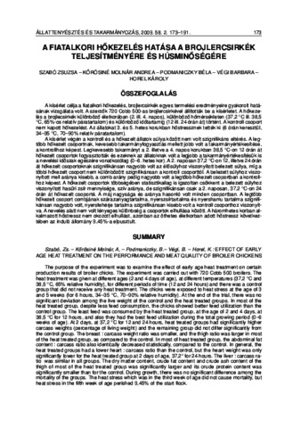 A kísérlet célja a fiatalkori hôkezelés, brojlercsirkék egyes termelési eredményeire gyakorolt hatásának vizsgálata volt. A szerzôk 720 Cobb 500-as brojlercsirkével állították be a kísérletet. A hôkezelés a brojlecsirkék különbözô életkorában (2. ill. 4. napos), különbözô hômérsékleten (37,2 °C ill. 38,5 °C, 65%-os relatív páratartalom) és különbözô idôtartamig (12 ill. 24 órán át) történt. A kontroll csoport nem kapott hôkezelést. Az állatokat 3. és 5. hetes korukban hôstressznek tették ki (6 órán keresztül, 34–35 °C, 70–90% relatív páratartalom). A kísérlet végén a kontroll és a hôkezelt állatok súlya között nem volt szignifikáns eltérés. A legtöbb hôkezelt csoportnak, kevesebb takarmányfogyasztás mellett jobb volt a takarmányértékesítése, a kontrollhoz képest. Legkevesebb takarmányt a 2. illetve a 4. napos korukban 38,5 °C-on 12 órán át hôkezelt csoportok fogyasztották és ezeknek az állatoknak volt a legjobb a takarmányértékesítésük is a nevelési idôszak egészére vonatkozólag (0–6. hetes kor). A 2. naposan 37,2 °C-on 12, illetve 24 órán át hôkezelt csoportoknak szignifikánsan nagyobb volt az élôsúlyhoz viszonyított belezett súlya, míg a többi hôkezelt csoport nem különbözött szignifikánsan a kontroll csoporttól. A belezett súlyhoz viszonyított mell aránya kisebb, a comb arány pedig nagyobb volt a legtöbb hôkezelt csoportban a kontrollhoz képest. A hôkezelt csoportok többségében statisztikailag is igazoltan csökkent a belezett súlyhoz viszonyított hasûri zsír mennyisége, szív aránya, de szignifikánsan csak a 2. naposan, 37,2 °C-on 24 órán át hôkezelt csoporté. A máj nagysága és aránya hasonló volt minden csoportban. A legtöbb hôkezelt csoport combjának szárazanyagtartalma, nyerszsírtartalma és nyershamu tartalma szignifikánsan nagyobb volt, nyersfehérje tartalma szignifikánsan kisebb volt a kontroll csoporthoz viszonyítva. A nevelés alatt nem volt lényeges különbség a csoportok elhullása között. A háromhetes korban alkalmazott hôstressz nem okozott elhullást, azonban az öthetes életkorban adott hôstressz következtében az induló állomány 9,45%-a elpusztult.