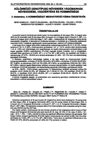 A szerzők hasonló körülmények között tartott 16 növendékbika (8 red angus (RA), 8 magyar tarka (MT)) és 32 növendék üsző (8 red angus (RA), 8 limousin (Ll), 8 magyar tarka x limousin F, (MT x Ll), valamint 8 magyar tarka x fehér-kék belga F, (MT x BB)) - rostélyosának {M. longissimus dorsi) kémiai összetételét vizsgálták. A laboratóriumi értékelést követően a hízóbikák és a hízóüszők adatbázisát ivaronként külön, t-próbával, egytényezős varianciaanalízissel, valamint chi^ próbával értékelték. A red angus és a magyar tarka bikák rostélyosának szárazanyag tartalma 25,16, ill. 25,10%, fehérje tartalma 21,34, ill. 21,84%, intramuscularis zsírtartalma 1,91, ill. 1,81%, ásványi elem tartalma pedig 1,15, ill. 1,03% volt, különbségek nem szignifikánsak. Az üszők intramuscularis zsírtartalmában a red angus egyedek (5,88%) szignifikánsan (P<0,05) nagyobb értéket mutattak, mint a vizsgálatban szereplő többi genotípus (Ll 4,05%, MT x Ll 3,71%, MT x BB 3,40%). Az üszőkből vett minták a szárazanyag- (27,37% - 28,04%) és a fehérje-tartalmában (21,46% - 22,17%) nem volt statisztikailag igazolgató különbség. A bikákban szignifikáns különbséget találtak a két fajta között az intramuscularis lipidek zsírsavösszetételében, a linolsav (C18:2n6; RA6,42%, MT 8,48%), a linolénsav (C18:3n6; RA 25,34%, MT 18,86%), az eikozénsav (C20:1n9; RA0,50%, MT 0,30%), az arachidonsav {C20:4n6; RA 1,35%, MT 2,09%), valamint egyéb többszörösen telítetlen zsírsavak arányát illetően. Az üszők esetében csak a linolénsav (C18:3n6) arányában volt statisztikailag igazolható különbség a genotípusok között. Az SFA- MUFA- PUFA (telített, egyszeresen, ill. többszörösen telítetlen zsírsavak) aránya RA bikákban 32,81-28,99-33,70%, MT bikákban 33,17-29,64-31,12%, RA üszőkben 33,42-34,7928,57%, Ll üszőkben 33,91-35,61-25,83%, MT x Ll üszőkben 32,39-35,44- 28,24%, MT x BB üszőkben 32,53-33,28-29,42% volt. A kémiai vizsgálatok alapján, az értékelésbe vont valamennyi genotípus rostélyosának zsírsavösszetétele a vártnál kedvezőbben alakult.