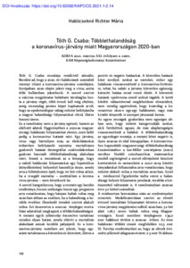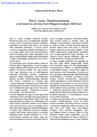 Hablicsekné, Richter Mária (2021) Tóth G. Csaba: Többlethalandóság a koronavírus-járvány miatt Magyarországon 2020-ban : KORFA 2021. március XXI. évfolyam 2. szám, KSH Népességtudományi Kutatóintézet. KAPOCS, 4 (1-2). pp. 128-129. ISSN 1588-7227