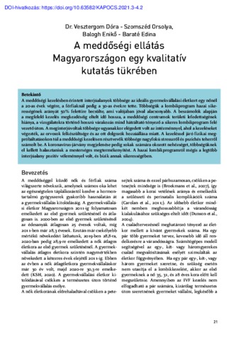Vesztergom, Dóra and Szomszéd, Orsolya and Balogh, Enikő and Baraté, Edina (2021) A meddőségi ellátás. KAPOCS, 4 (3-4). pp. 21-35. ISSN 1588-7227