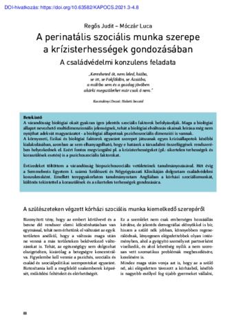Regős, Judit and Móczár, Luca (2021) A perinatális szociális munka szerepe a krízisterhességek gondozásában. KAPOCS, 4 (3-4). pp. 88-97. ISSN 1588-7227