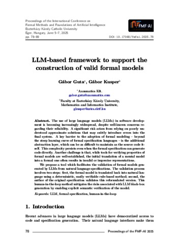 Guta, Gábor and Kusper, Gábor (2025) LLM-based framework to support the construction of valid formal models. In: Proceedings of the International Conference on Formal Methods and Foundations of Artificial Intelligence. Eszterházy Károly Katolikus Egyetem Líceum Kiadó, Eger, pp. 78-89. ISBN 9789634963035